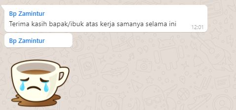 Di akhir percakapan, diterima kalimat ucapan dari Bapak Kepala Sekolah “Terimakasih bapak/ibuk atas kerjasamanya selama ini.” Ada sesuatu yang berbeda dan dirasa aneh dengan kalimat singkat tersebut. Tanpa kami sadari ternyata itu adalah salam terimakasih dan perpisahan dari Kepala Sekolah.